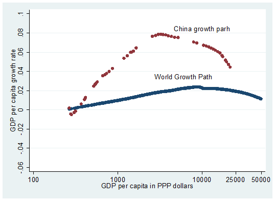 Where is China in this story? Its own growth part is shown by the red line (again, using a non-parametric regression). Clearly China had a tremendous acceleration of growth compared to the typical world growth path, but also a much sharper deceleration. (The slopes of both the upward and the downward portions of the Chinese inverted U curve are much sharper than for the same curve for the world.) But despite a sharp deceleration, China’s growth today is still much higher than the growth of a typical country at China’s income level. There is a gap between the red and the blue lines: on average, we would—following the world experience—expect China to grow at 2%, but it is growing at 4.5%.