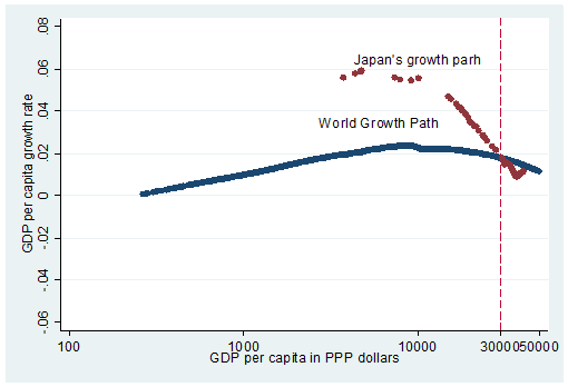 The question is, Will China’s deceleration be as fast as Japan’s? Could the graph for China drop so much and fast that by the time China reaches about $PPP 30,000 it hits the blue line, and Chinese growth becomes neither more nor less remarkable than the usual growth rate at that income level? This is, of course, a crucial question that nobody can answer now. But if one were simply to take a thick marker and draw the red line by continuing it the way that it seems to go now (i.e. keeping the same slope), China would hit the blue line around a GDP per capita of $PPP 32,000—income level that is about ½ higher than today’s. That does not mean that it will stop growing. It would still grow at the rate of approximately 2% per capita per annum but that rate would be neither higher nor lower than that of countries at the same income level. In that (hypothetical) case, the China’s exceptionalism, would be over.