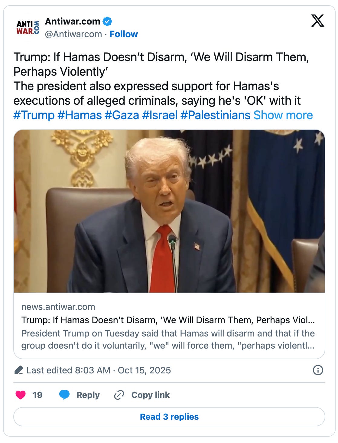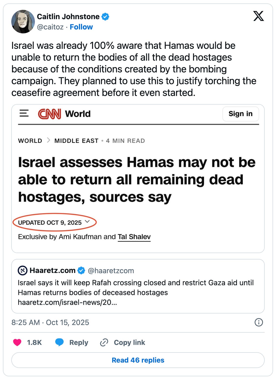 So for all the applause and fuss that has been made about the ceasefire, as things stand right now it doesn’t look like much has changed. From the very beginning of this genocide it has been the officially stated position of the US and Israel that the killing will not end until Hamas lays down its arms and surrenders, and that is still their position today. There’s a much-needed pause in the slaughter, sure, but the Trumpanyahu team is making it explicitly clear that it is going to ramp up again under the justification of Hamas refusing to disarm.