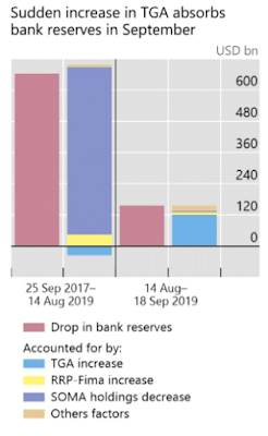 The total quantity of reserves in the system has been falling since 2015 due to the Fed running off its balance sheet: from mid-2018 onwards, reserves have been draining even faster due to higher debt issuance by the US Treasury, which the Fed has done nothing to offset. The BIS says that as reserves have become scarcer, and Treasuries more abundant, the big banks have reduced their reserve holdings in favour of Treasuries. But this means that they have less cash to lend. The repo market depends on them for cash, but they are becoming increasingly reluctant to lend it.