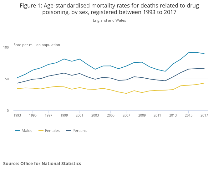 This helpful chart from ONS shows the change in drug-related deaths in England and Wales since 1993: