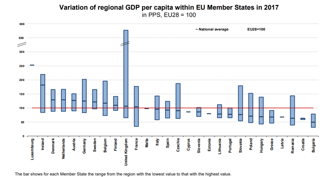 Looking beyond British shores, the ONS says that the drug-induced deaths rate (for those aged 15 to 64 years) for the EU, Turkey and Norway was less than a third of the rate in England and Wales. And this brings me to my final chart. Here is Eurostat’s comparative presentation of regional inequality in the 28 countries making up the EU: