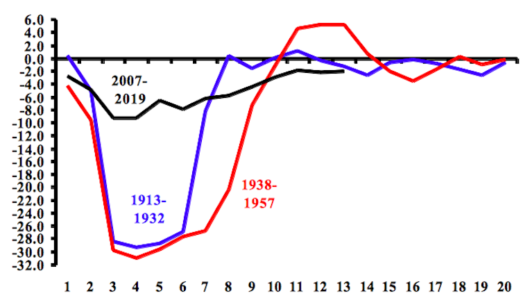 The next chart looks at these periods’ fiscal deficits, meaning government income minus outgoings. Both war-time deficits reached about 30% of GDP then quickly declined, hitting surplus after eight and ten years respectively.