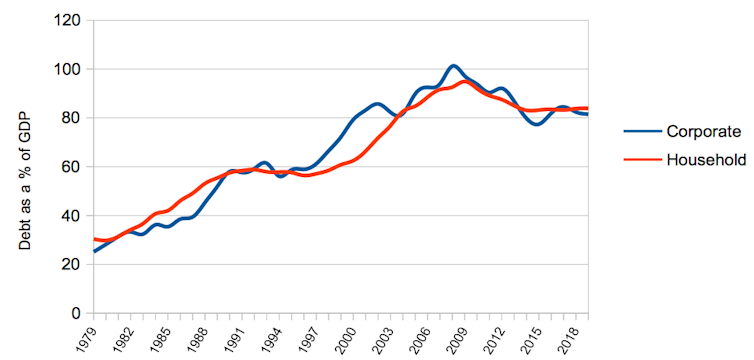Admittedly recovery could be undermined by household and business debt vastly higher than after the second world war. Both have eased since the 2007-09 crisis, per the chart below, but household debt in particular is rising again – driven this time by credit card and student debt rather than mortgages.