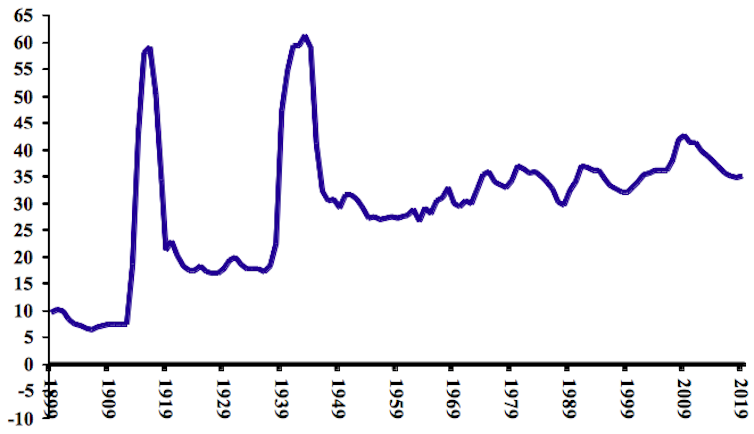 Wartime public expenditure peaked at 61% of GDP in 1945. During the Attlee years it settled into the 30% range – over ten points higher than in 1938 – partly spent establishing the NHS. Even when the Conservatives took over in 1951, spending never again fell below 27% of GDP.