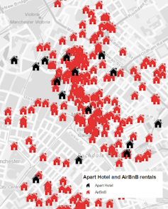 To find out exactly how short-term rentals are affecting regional cities such as Manchester, I undertook research to collect data on 22 serviced apartment schemes, containing 1,198 units across central Manchester and neighbouring Salford during 2017. The average starting price for a night in a serviced apartment was £99, and owners made an average monthly income of £2,563 per unit. The financial rewards of investing in serviced apartments clearly outweigh the returns on long-term rentals for residents, which yield around £850 per month.