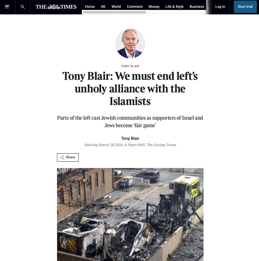 Anyone who has studied Blair’s back-catalogue of opinion pieces will hardly be surprised by the Sunday Times headline: “We must end left’s unholy alliance with the Islamists.”