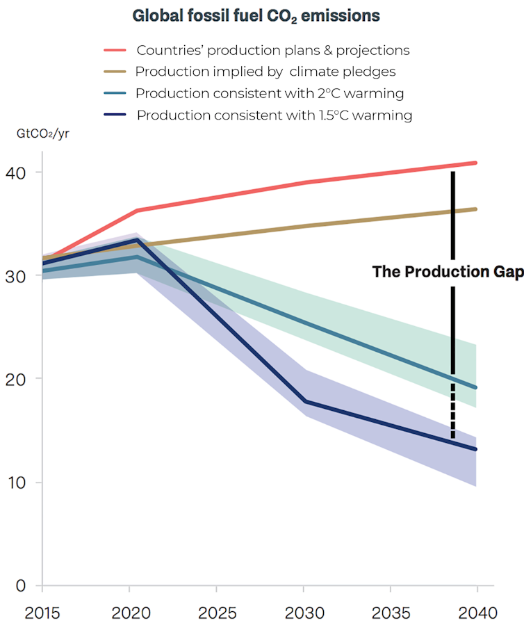 The gap is also substantial for oil and gas. Countries are projected to produce 43% more oil and 47% more gas by 2040 than is consistent with a 2℃ pathway.